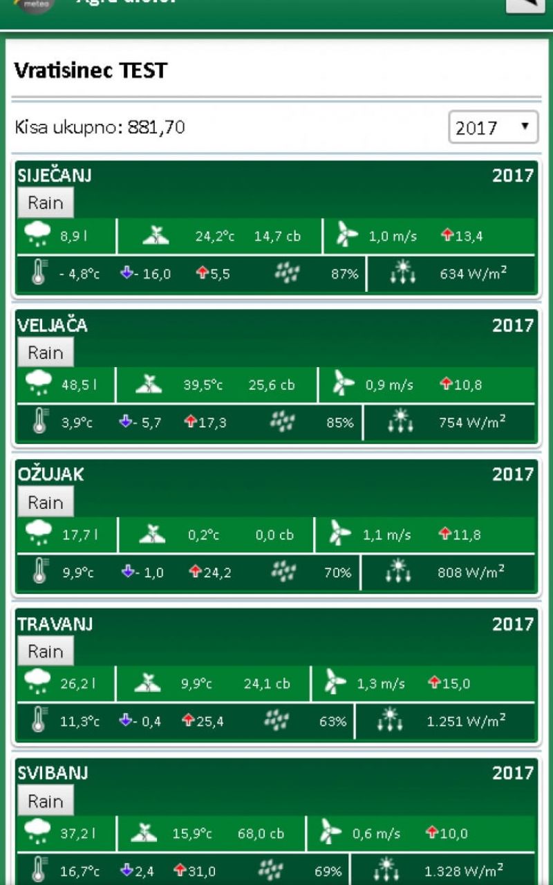 Za meteo stanicu razvili smo mobilnu aplikaciju pomoću koje je moguće imati uvid u trenutno očitanje meteo stanice i svih senzora okačenih na istu. Na jednostavan naćin moguće je i provjeriti povjesne podatke meteo satnice i bilo kojeg senzora.